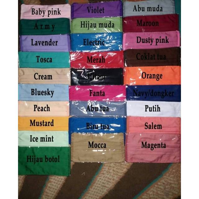 20+ Masker Hijab Kain Warna Warni. Hitam, biru, krem, coklat, merah, pink, biru, abu, hijau, kuning, putih (mohohon sertakan pilihan warna alternatid bila stok kosong akan kami kirimkan stok tersedia * no komplain) masker kain polos warna warni tali panjang/masker hijab/masker motor. Pilih masker kain warna hijab yang mungkin banyak diminati atau yang memiliki rating point banyak sehingga anda bisa mendapatkan masker kain jika belanja masker kain warna hijab di toko online sosial media, pilihlah yang menulis dengan jelas informasi alamat serta kontak yang bisa dihubungi.